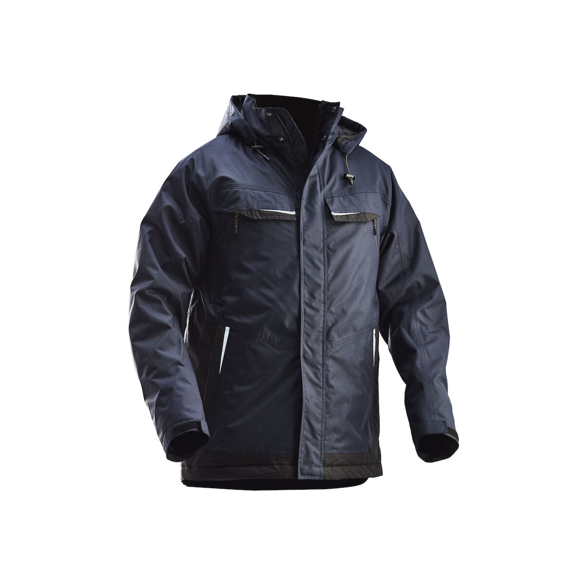 Wind- und wasserdichte Steppjacke mit verschweißten Nähten. Geräumige doppelte Brusttaschen; zwei mit Klappen und Klettverschluss und zwei mit wasserdichtem Reißverschluss. Vordertaschen mit Patte und Reißverschluss. Drei Innentaschen, zwei mit Reißverschluss, eine mit Klettverschluss. Verstellbare Ärmel und Saum. Reflektierende Details an den Taschen und am unteren Rücken. Gesteppte Kapuze mit Kordelzug, abnehmbar mit Druckknöpfen. Wassersäule: 23000 mm. Atmungsaktivität: 3300 g/m² 24h.