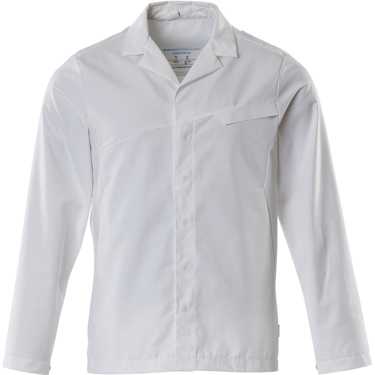 Verschluss mit verdeckten Druckknöpfen. Druckknopfverschluss an den Manschetten. Druckknöpfe aus Metall. Schlitze an den Seiten. Vorbereitet für den Einbau von personalisiertem Etikett, HF- und UHF-Chip. Farbbeschriftung für alle Größen. Geeignet für Industriewäsche.