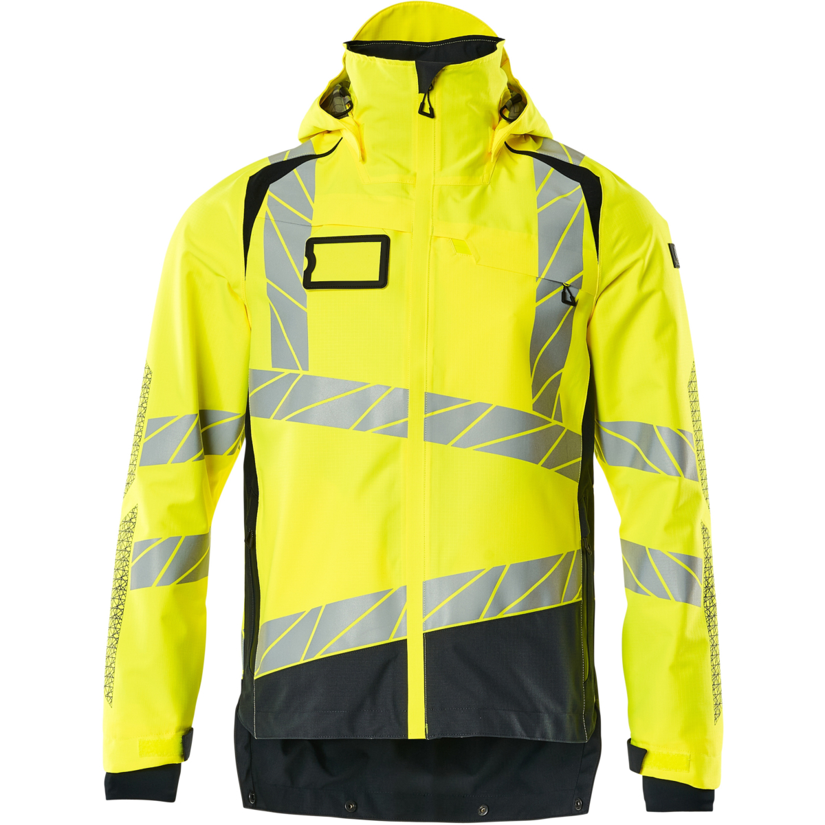 Fluoreszierend und mit vertikalen und schrägen, quer verlaufenden Reflexstreifen. Der Stoff ist äußerst strapazierfähig, atmungsaktiv, wind- und wasserdicht. Verklebte Nähte. Abnehmbare, gefütterte Kapuze mit verstellbarem Kordelzug. Verschluss mit wasserdichtem Reißverschluss und doppelter Sturmklappe. Innentasche – zwei mit Reißverschlüssen und eine mit offenem Netz. Abnehmbarer Ausweishalter. Brusttasche mit wasserdichtem Reißverschluss. Vordertaschen mit wasserdichten Reißverschlüssen. Hoher Kragen. Rippbündchen an der Innenseite des unteren Saums an der Vorderseite der Jacke. Die Klappe auf der Rückseite der Jacke kann für eine normale Rückenlänge hochgeklappt oder für eine verlängerte Rückenlänge geöffnet werden. Rippbündchen (in der Sturmklappe versteckt) an den Bündchen. Klettverschluss an den Bündchen. Mit Druckeffekten.