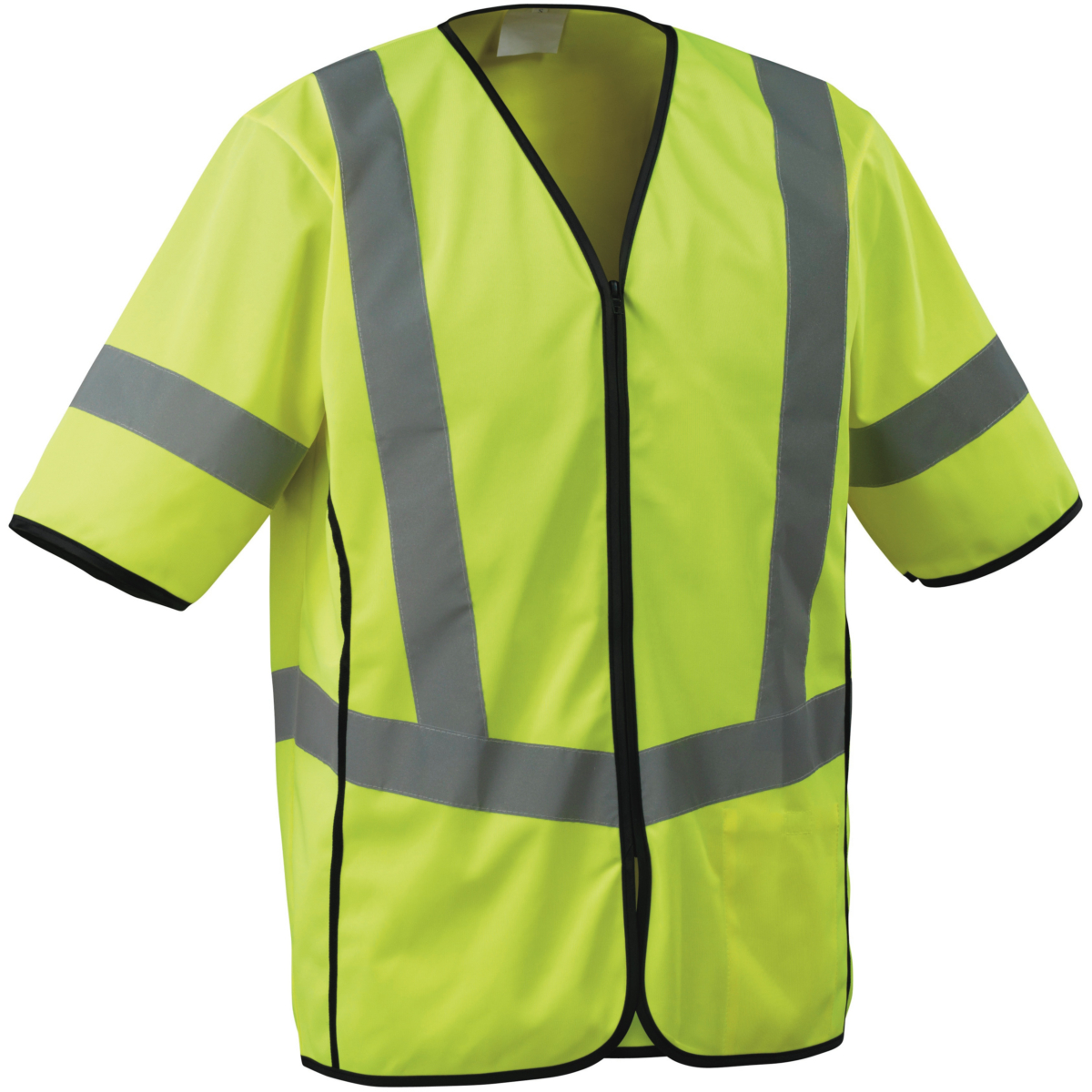 Fluoreszierend mit vertikalem und horizontalem reflektierendem Band. Reißverschluss direkt durch. Innentasche. Mit Band eingefasst. Große Größe – zum Tragen über normaler Kleidung.